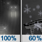 Temperature: 28°F Wind Speed: 6 to 10 mph Wind Direction: NE Forecast: Rain before 2am, then a chance of rain and snow between 2am and 3am, then a chance of snow and a chance of freezing rain. Cloudy, with a low around 28. Northeast wind 6 to 10 mph. Chance of precipitation is 100%. New rainfall amounts between a quarter and half of an inch possible. |