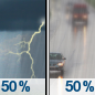Temperature: 51°F Wind Speed: 2 to 6 mph Wind Direction: NW Forecast: A chance of rain before 7pm, then a slight chance of showers and thunderstorms between 7pm and 1am, then a chance of showers and thunderstorms. Mostly cloudy, with a low around 51. Chance of precipitation is 50%. |