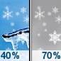 Temperature: 35°F Wind Speed: 7 mph Wind Direction: NE Forecast: A chance of snow. Mostly cloudy, with a high near 35. Northeast wind around 7 mph. Chance of precipitation is 40%. |