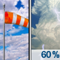 Temperature: 58°F Wind Speed: 18 to 22 mph Wind Direction: NW Forecast: Rain showers likely between noon and 3pm, then showers and thunderstorms likely. Partly sunny. High near 58, with temperatures falling to around 44 in the afternoon. Northwest wind 18 to 22 mph, with gusts as high as 32 mph. Chance of precipitation is 60%. |