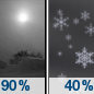 Temperature: 13°F Wind Speed: 5 to 10 mph Wind Direction: W Forecast: Snow showers. Cloudy, with a low around 13. Chance of precipitation is 90%. New snow accumulation of around one inch possible. |