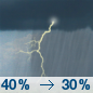 Temperature: 61°F Wind Speed: 5 to 10 mph Wind Direction: SW Forecast: Showers and thunderstorms. Cloudy, with a low around 61. Southwest wind 5 to 10 mph. Chance of precipitation is 80%. |