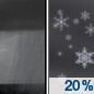 Temperature: 21°F Wind Speed: 3 to 8 mph Wind Direction: WSW Forecast: A chance of snow after noon. Mostly sunny, with a high near 21. Chance of precipitation is 30%. |