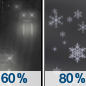 Temperature: 34°F Wind Speed: 7 to 12 mph Wind Direction: SSW Forecast: Snow. Mostly cloudy, with a high near 34. South southwest wind 7 to 12 mph, with gusts as high as 31 mph. Chance of precipitation is 80%. New snow accumulation of 1 to 3 inches possible. |