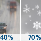 Temperature: 36°F Wind Speed: 5 to 9 mph Wind Direction: N Forecast: A chance of snow. Mostly cloudy, with a high near 36. North wind 5 to 9 mph. Chance of precipitation is 40%. |