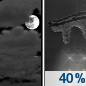 Temperature: 32°F Wind Speed: 0 to 5 mph Wind Direction: N Forecast: A chance of rain before 7pm. Cloudy, with a low around 32. North wind 0 to 5 mph. Chance of precipitation is 40%. |