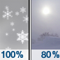 Temperature: 17°F Wind Speed: 8 to 13 mph Wind Direction: W Forecast: Snow showers likely. Mostly cloudy, with a low around 17. Chance of precipitation is 70%. |