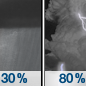 Temperature: 74°F Wind Speed: 5 mph Wind Direction: W Forecast: Showers and thunderstorms. Partly sunny, with a high near 74. West wind around 5 mph. Chance of precipitation is 80%. |