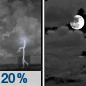 Temperature: 43°F Wind Speed: 7 to 13 mph Wind Direction: W Forecast: Showers and thunderstorms. Mostly cloudy, with a low around 43. Chance of precipitation is 80%. |