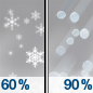 Temperature: 34°F Wind Speed: 9 to 14 mph Wind Direction: E Forecast: Snow likely between 7am and 1pm, then snow and sleet and rain showers. Cloudy, with a high near 34. East wind 9 to 14 mph. Chance of precipitation is 90%. New snow accumulation of 1 to 2 inches possible. |