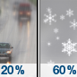 Temperature: 21°F Wind Speed: 7 to 10 mph Wind Direction: W Forecast: Scattered snow showers before 7pm, then snow likely. Mostly cloudy, with a low around 21. Chance of precipitation is 70%. |
