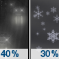 Temperature: 32°F Wind Speed: 2 to 6 mph Wind Direction: SSW Forecast: A chance of rain before 2am, then a chance of rain and snow between 2am and 5am. Mostly cloudy, with a low around 32. Chance of precipitation is 40%. |