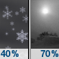 Temperature: 38°F Wind Speed: 16 to 25 mph Wind Direction: WSW Forecast: A chance of snow. Partly sunny, with a high near 38. West southwest wind 16 to 25 mph, with gusts as high as 37 mph. Chance of precipitation is 40%. New snow accumulation of less than half an inch possible. |