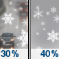 Temperature: 2°F Wind Speed: 7 mph Wind Direction: SW Forecast: A chance of snow showers. Mostly cloudy, with a low around 2. Southwest wind around 7 mph. Chance of precipitation is 30%. |
