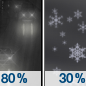 Temperature: 21°F Wind Speed: 0 to 5 mph Wind Direction: W Forecast: A chance of snow after 1am. Mostly cloudy, with a low around 21. Chance of precipitation is 30%. |