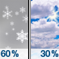 Temperature: 30°F Wind Speed: 10 mph Wind Direction: W Forecast: Snow. Mostly cloudy, with a high near 30. Chance of precipitation is 80%. |