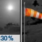 Temperature: 30°F Wind Speed: 7 mph Wind Direction: S Forecast: Rain and snow likely. Mostly cloudy, with a low around 30. Chance of precipitation is 70%. |