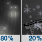 Temperature: 32°F Wind Speed: 9 mph Wind Direction: SW Forecast: A chance of snow. Mostly cloudy, with a low around 32. Chance of precipitation is 50%. |