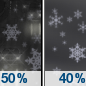 Temperature: 17°F Wind Speed: 7 mph Wind Direction: NW Forecast: A slight chance of snow. Mostly cloudy, with a low around 17. |