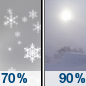 Temperature: 14°F Wind Speed: 10 to 14 mph Wind Direction: W Forecast: Snow showers likely. Mostly cloudy, with a low around 14. West wind 10 to 14 mph. Chance of precipitation is 70%. |