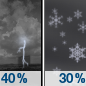 Temperature: 12°F Wind Speed: 15 to 20 mph Wind Direction: NNW Forecast: A chance of snow. Mostly cloudy, with a low around 12. North northwest wind 15 to 20 mph, with gusts as high as 30 mph. Chance of precipitation is 40%. New snow accumulation of less than half an inch possible. |