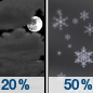 Temperature: 12°F Wind Speed: 5 mph Wind Direction: W Forecast: A slight chance of freezing rain before 1am, then a slight chance of snow showers. Mostly cloudy, with a low around 12. |