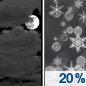 Temperature: 20°F Wind Speed: 7 mph Wind Direction: SW Forecast: A slight chance of snow after noon. Mostly sunny, with a high near 20. Chance of precipitation is 20%. |