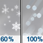 Temperature: 34°F Wind Speed: 5 to 10 mph Wind Direction: S Forecast: A chance of snow between 7am and 1pm, then rain and snow likely. Mostly cloudy, with a high near 34. Chance of precipitation is 60%. |