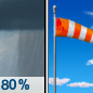 Temperature: 80°F Wind Speed: 9 to 16 mph Wind Direction: S Forecast: Partly sunny, with a high near 80. |