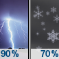 Temperature: 33°F Wind Speed: 3 to 9 mph Wind Direction: SSW Forecast: Showers and thunderstorms before 11pm, then rain likely between 11pm and 2am, then rain and snow likely. Cloudy, with a low around 33. |