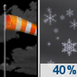 Temperature: 12°F Wind Speed: 5 mph Wind Direction: NNW Forecast: A chance of snow. Mostly cloudy, with a low around 12. Chance of precipitation is 30%. |