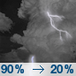 Temperature: 54°F Wind Speed: 5 to 10 mph Wind Direction: W Forecast: Showers and thunderstorms likely before 9pm, then a chance of showers and thunderstorms between 9pm and 3am. Mostly cloudy. Low around 54, with temperatures rising to around 56 overnight. West wind 5 to 10 mph. Chance of precipitation is 90%. |