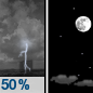 Temperature: 50°F Wind Speed: 6 to 9 mph Wind Direction: E Forecast: Showers and thunderstorms likely. Mostly cloudy, with a low around 50. Chance of precipitation is 70%. |