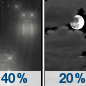 Temperature: 41°F Wind Speed: 1 to 6 mph Wind Direction: WSW Forecast: A chance of rain before 11pm. Mostly cloudy, with a low around 41. |