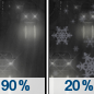 Temperature: 26°F Wind Speed: 5 mph Wind Direction: NE Forecast: A chance of snow after 1am. Mostly cloudy, with a low around 26. Chance of precipitation is 30%. |