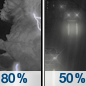Temperature: 71°F Wind Speed: 3 to 7 mph Wind Direction: W Forecast: Showers and thunderstorms. Mostly cloudy, with a high near 71. Chance of precipitation is 80%. |