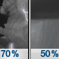 Temperature: 46°F Wind Speed: 0 to 5 mph Wind Direction: S Forecast: A chance of showers and thunderstorms before 8pm, then patchy fog and a chance of showers and thunderstorms between 8pm and 11pm, then patchy fog and scattered rain showers. Mostly cloudy, with a low around 46. South wind 0 to 5 mph. Chance of precipitation is 70%. New rainfall amounts between a tenth and quarter of an inch possible. |