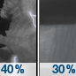 Temperature: 54°F Wind Speed: 1 to 6 mph Wind Direction: E Forecast: A chance of rain showers before 8pm, then a chance of showers and thunderstorms between 8pm and 9pm, then patchy fog and a chance of showers and thunderstorms between 9pm and 11pm, then patchy fog and a slight chance of rain showers between 11pm and midnight, then a chance of rain showers and patchy fog between midnight and 1am, then patchy fog and a slight chance of rain showers. Mostly cloudy, with a low around 54. East wind 1 to 6 mph. Chance of precipitation is 40%. New rainfall amounts less than a tenth of an inch possible. |