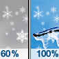 Temperature: 29°F Wind Speed: 2 to 7 mph Wind Direction: N Forecast: Freezing rain before 8pm, then freezing rain and a chance of sleet and a chance of rain between 8pm and 9pm, then freezing rain and a chance of sleet and rain and snow likely between 9pm and 10pm, then patchy fog and a slight chance of sleet and rain and snow. Cloudy, with a low around 29. North wind 2 to 7 mph. Chance of precipitation is 100%. New snow accumulation of less than half an inch possible. Little or no ice accumulation expected. |