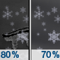Temperature: 34°F Wind Speed: 14 mph Wind Direction: N Forecast: A chance of snow. Mostly cloudy, with a high near 34. North wind around 14 mph. Chance of precipitation is 50%. |