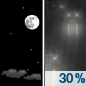 Forecast: A chance of rain after 5am. Mostly clear, with a low around 53. North wind 5 to 10 mph, with gusts as high as 20 mph. Chance of precipitation is 30%.