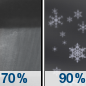 Temperature: 34°F Wind Speed: 13 to 18 mph Wind Direction: S Forecast: Rain showers between 8pm and 2am, then rain and snow showers. Mostly cloudy. Low around 34, with temperatures rising to around 37 overnight. South wind 13 to 18 mph, with gusts as high as 25 mph. Chance of precipitation is 90%. |