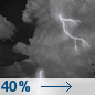 Temperature: 40°F Wind Speed: 0 to 10 mph Wind Direction: N Forecast: Showers and thunderstorms likely before 1am. Mostly cloudy, with a low around 40. North wind 0 to 10 mph. Chance of precipitation is 40%. New rainfall amounts less than a tenth of an inch possible. |