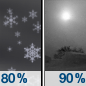 Temperature: 36°F Wind Speed: 12 to 21 mph Wind Direction: N Forecast: Snow and areas of blowing snow. Cloudy, with a high near 36. Chance of precipitation is 90%. New snow accumulation of 2 to 4 inches possible. |