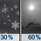 Temperature: 36°F Wind Speed: 13 to 18 mph Wind Direction: SW Forecast: A chance of snow showers before 5pm. Partly sunny, with a high near 36. Southwest wind 13 to 18 mph, with gusts as high as 30 mph. Chance of precipitation is 40%. New snow accumulation of less than half an inch possible. |