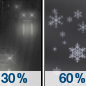 Temperature: 25°F Wind Speed: 5 to 10 mph Wind Direction: N Forecast: A chance of snow. Mostly cloudy, with a low around 25. Chance of precipitation is 40%. |