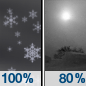 Temperature: 30°F Wind Speed: 15 to 20 mph Wind Direction: N Forecast: Snow before 3am, then snow and areas of blowing snow. Cloudy, with a low around 30. North wind 15 to 20 mph, with gusts as high as 35 mph. Chance of precipitation is 100%. New snow accumulation of 7 to 11 inches possible. |