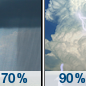 Temperature: 70°F Wind Speed: 0 to 5 mph Wind Direction: W Forecast: Rain showers likely before 2pm, then showers and thunderstorms. Mostly cloudy, with a high near 70. Chance of precipitation is 90%. |