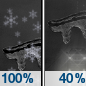 Temperature: 29°F Wind Speed: 9 to 13 mph Wind Direction: N Forecast: A chance of snow. Mostly cloudy, with a high near 29. Chance of precipitation is 40%. |