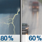 Temperature: 48°F Wind Speed: 6 mph Wind Direction: NE Forecast: Showers and thunderstorms. Cloudy, with a low around 48. Northeast wind around 6 mph. Chance of precipitation is 90%. New rainfall amounts between a half and three quarters of an inch possible. |